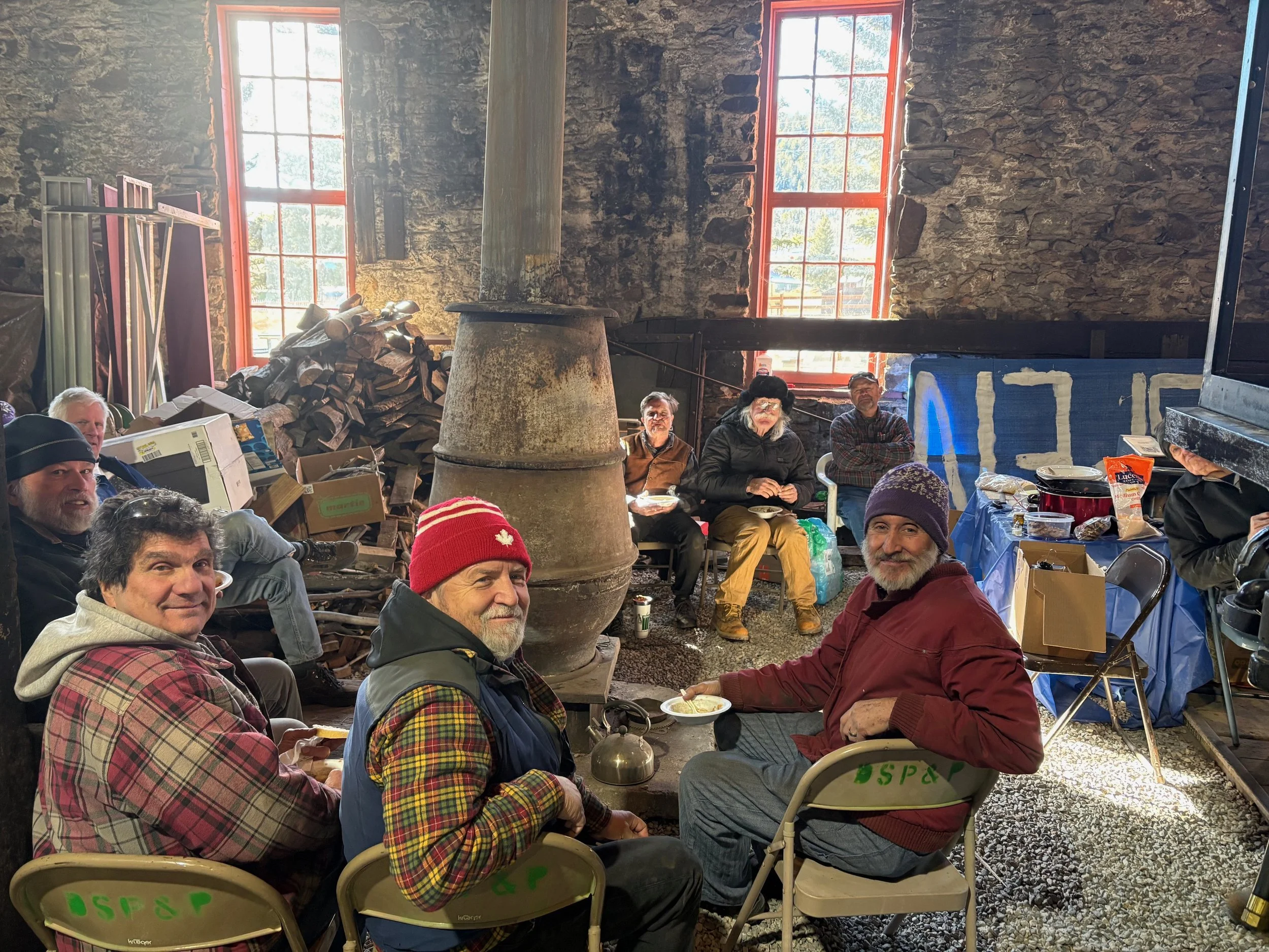 Lunch!! Clockwise from top: Siegfried, Bob P., Steve, Jimmy, Tim, Mike A., Jim V., James & Jon. Jonah is behind stove.
