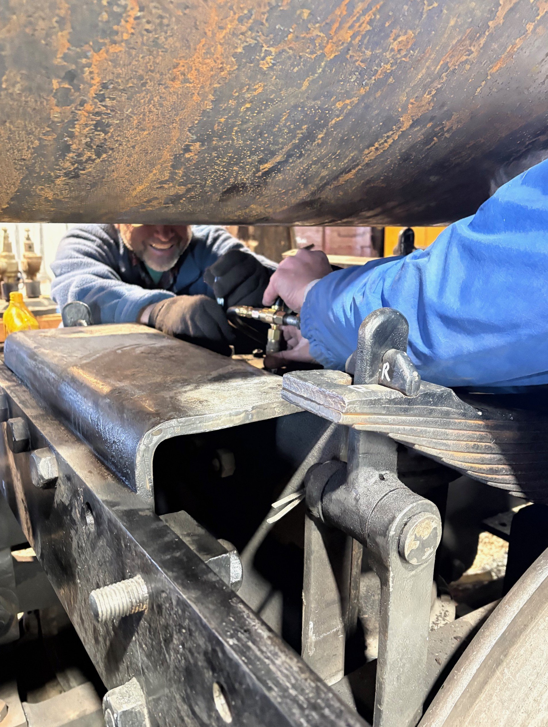 Another major task completed and maybe more interesting (at least more interesting to watch), we rigged up the locomotive’s brakes (which have never worked in Como). After a little oil and elbow grease we have the brake cylinders and brake rigging working! Steve Burt & Jon Dierksheide rigging up Machine Shop air compressor hose to brake manifold.