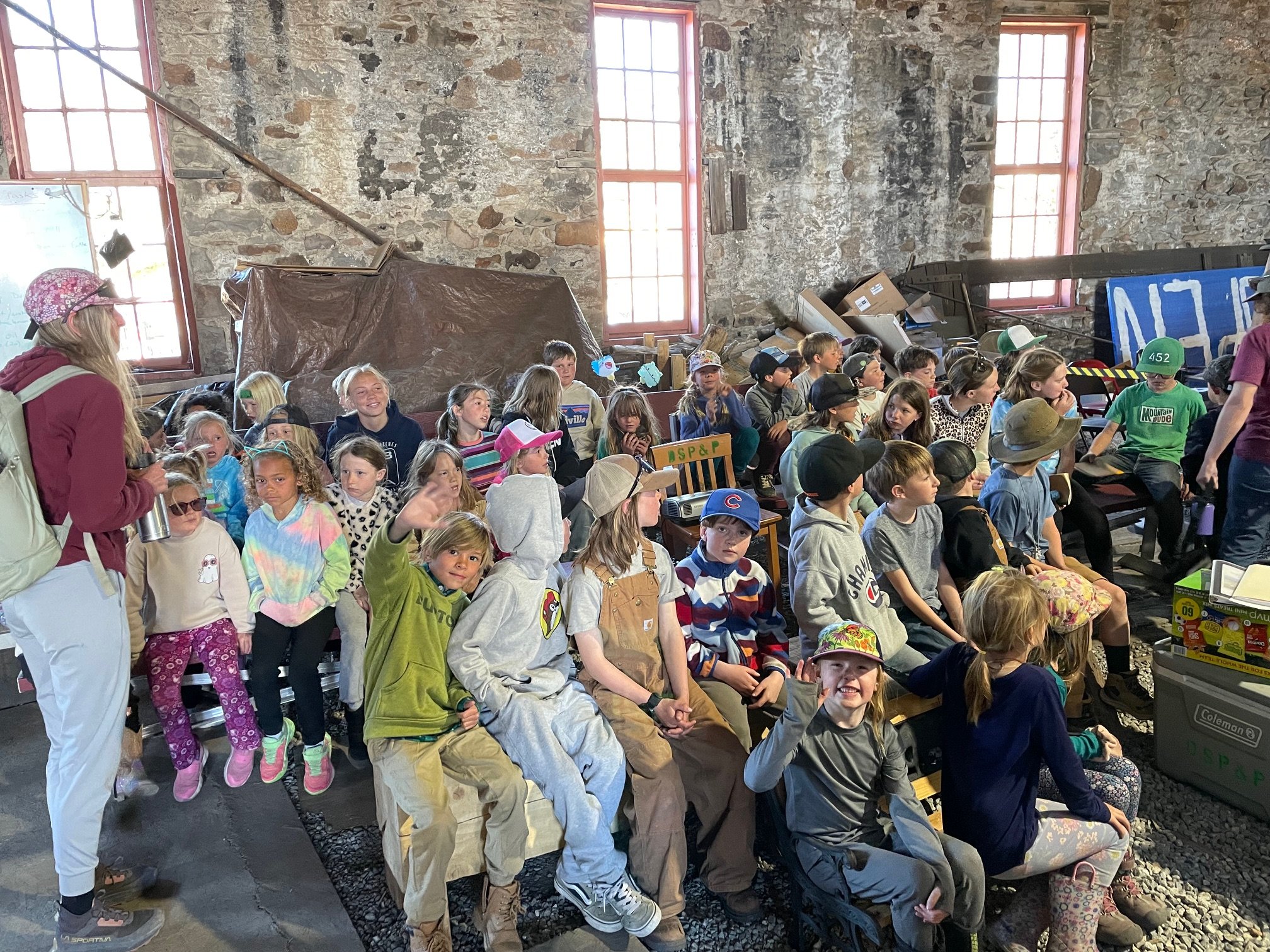 The teachers / chaperones brought them into the Roundhouse to our temporary classroom - they were very orderly and inquisitive. Of note was the little girl in the front row waving - she asked the most questions and many about “how steel is made”, which was stumper we were not prepared for!